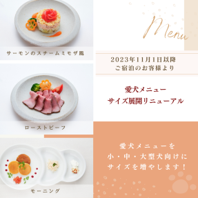 2023.6.15.「2023年11月1日以降のご宿泊のお客様」より愛犬メニュー ”サイズリニューアル”